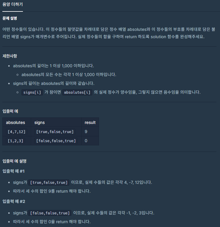 - 절대값이 담겨있는 정수 배열 absolutes의 길이 = 정수들의 부호가 담겨있는 배열 signs의 길이