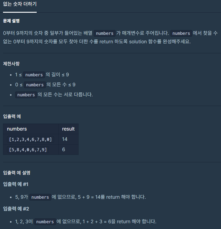 💡 numbers의 숫자를 모두 더하고 0부터 9의 합계인 45에서 빼는 방법을 사용한 코드