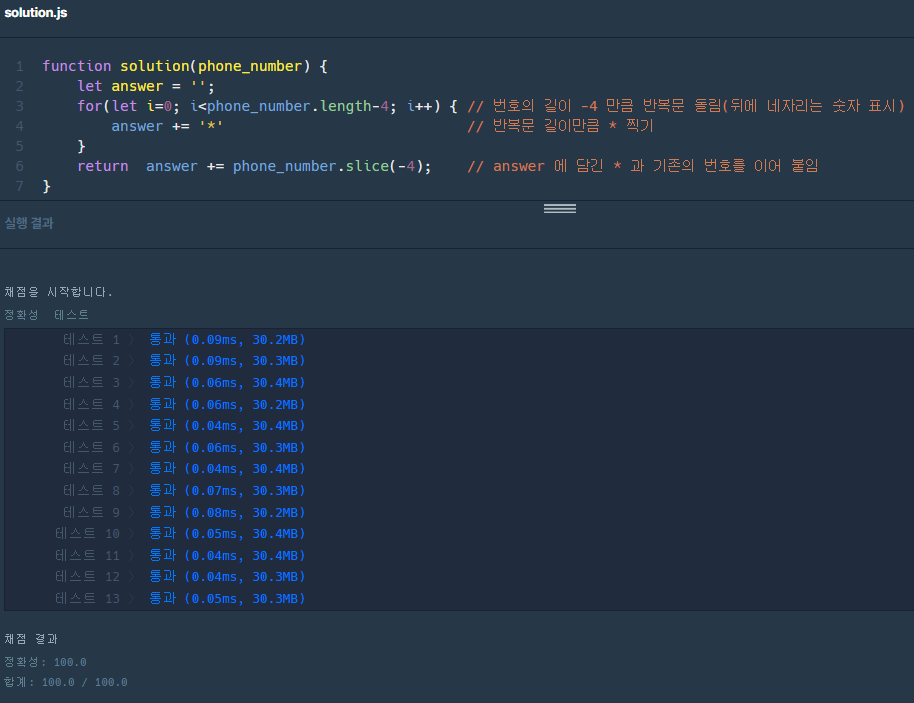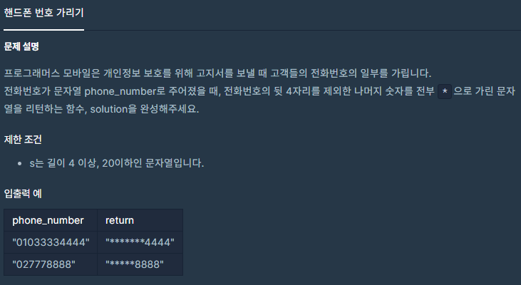 프로그래머스 모바일은 개인정보 보호를 위해 고지서를 보낼 때 고객들의 전화번호의 일부를 가립니다. 전화번호가 문자열 phone_number로 주어졌을 때, 전화번호의 뒷 4자리를 제외한 나머지 숫자