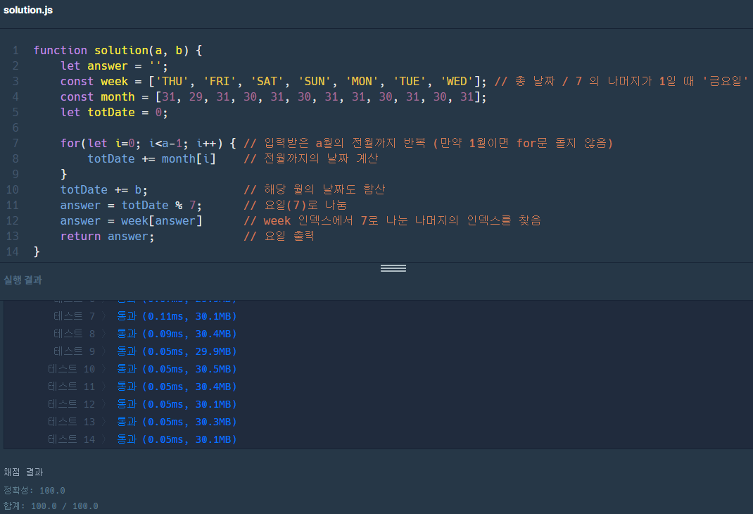 const week = ['THU', 'FRI', 'SAT', 'SUN', 'MON', 'TUE', 'WED']; // 총 날짜 / 7 의 나머지가 1일 때 '금요일'