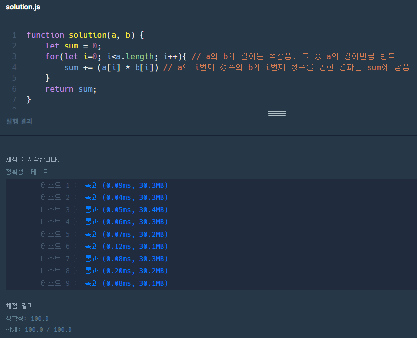 - 반복문이 돌면서 a[i]값과 b[i]값을 곱하고, 연산 결과를 sum에 담는다.
