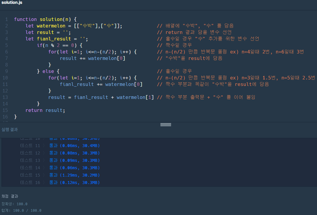 길이가 n이고, "수박수박수박수...."와 같은 패턴을 유지하는 문자열을 리턴하는 함수, solution을 완성하세요. 예를들어 n이 4이면 "수박수박"을 리턴하고 3이라면 "수박수"를 리턴하면 됩니다. 제한