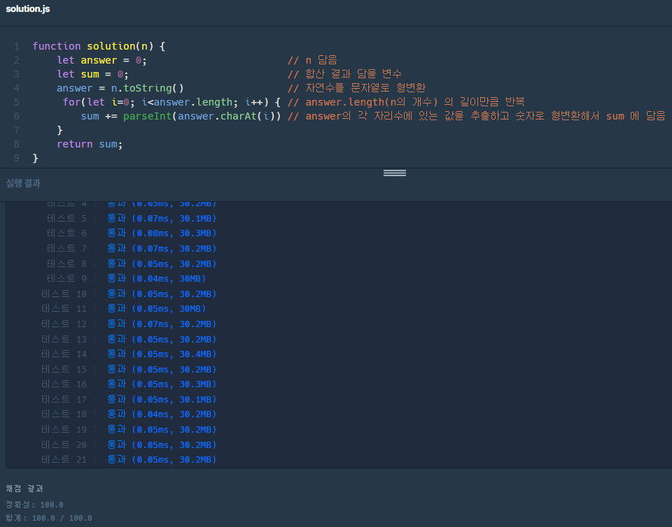자연수 N이 주어지면, N의 각 자릿수의 합을 구해서 return 하는 solution 함수를 만들어 주세요. 예를들어 N = 123이면 1 + 2 + 3 = 6을 return 하면 됩니다. 제한사항 N의 범위 : 100,000,000 이하의 자연수 입출