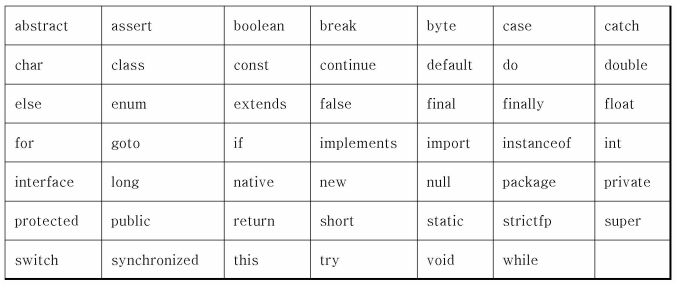 (자바 예약어는 소문자로 이루어져 있고 대소문자를 구분하므로 TRUE, FALSE,NULL은 자바 예약어가 아님)