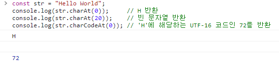 - console result 1 이미지에서 console.log(str.charCodeAt(0)); 으로 찍었을 때, str의 0번째 인덱스 'H'의 UTF-16 값인 72를 반환했다.