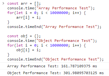 때문에 아래 스크린샷과 같이 Array일 경우 Object 보다 약 2배 정도 빠른 것을 알 수 있다.