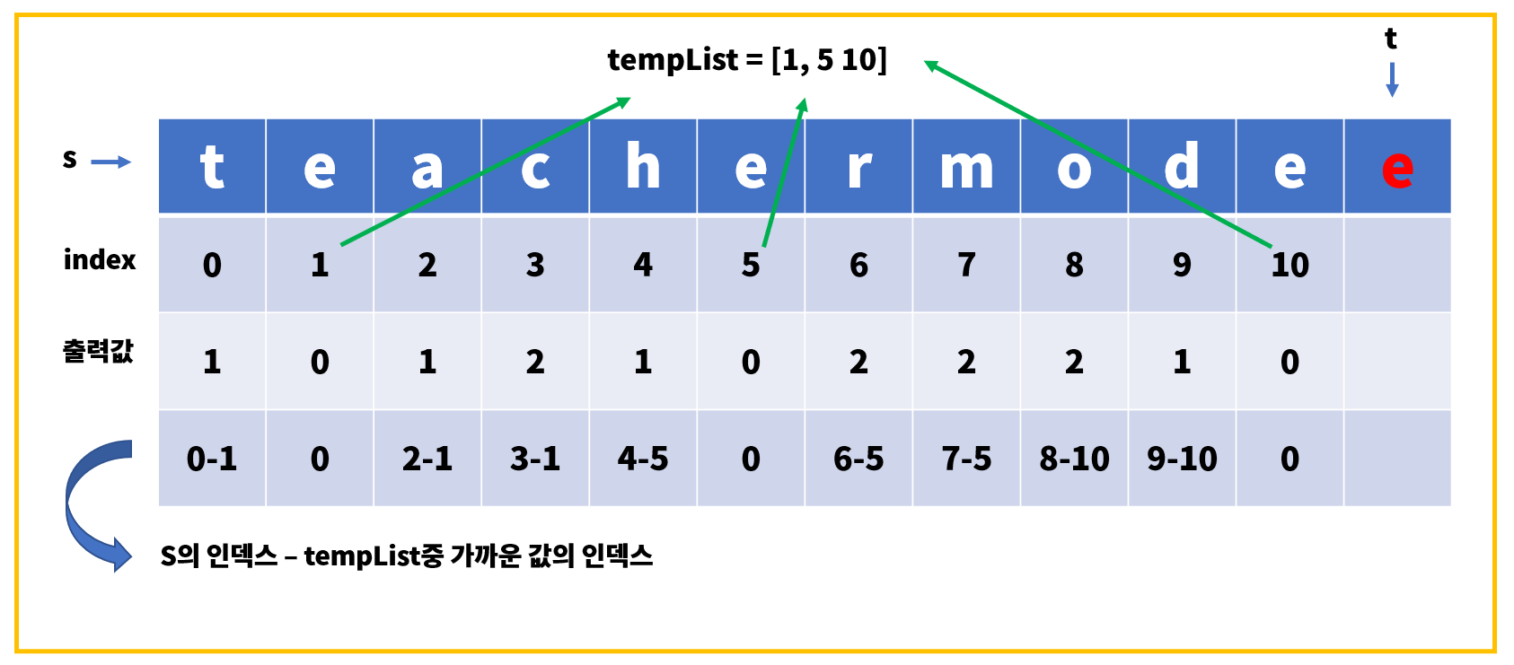 min = Math.abs(s.indexOf(s[i]) - tempList[j]); // 해당 값을 min에 담음