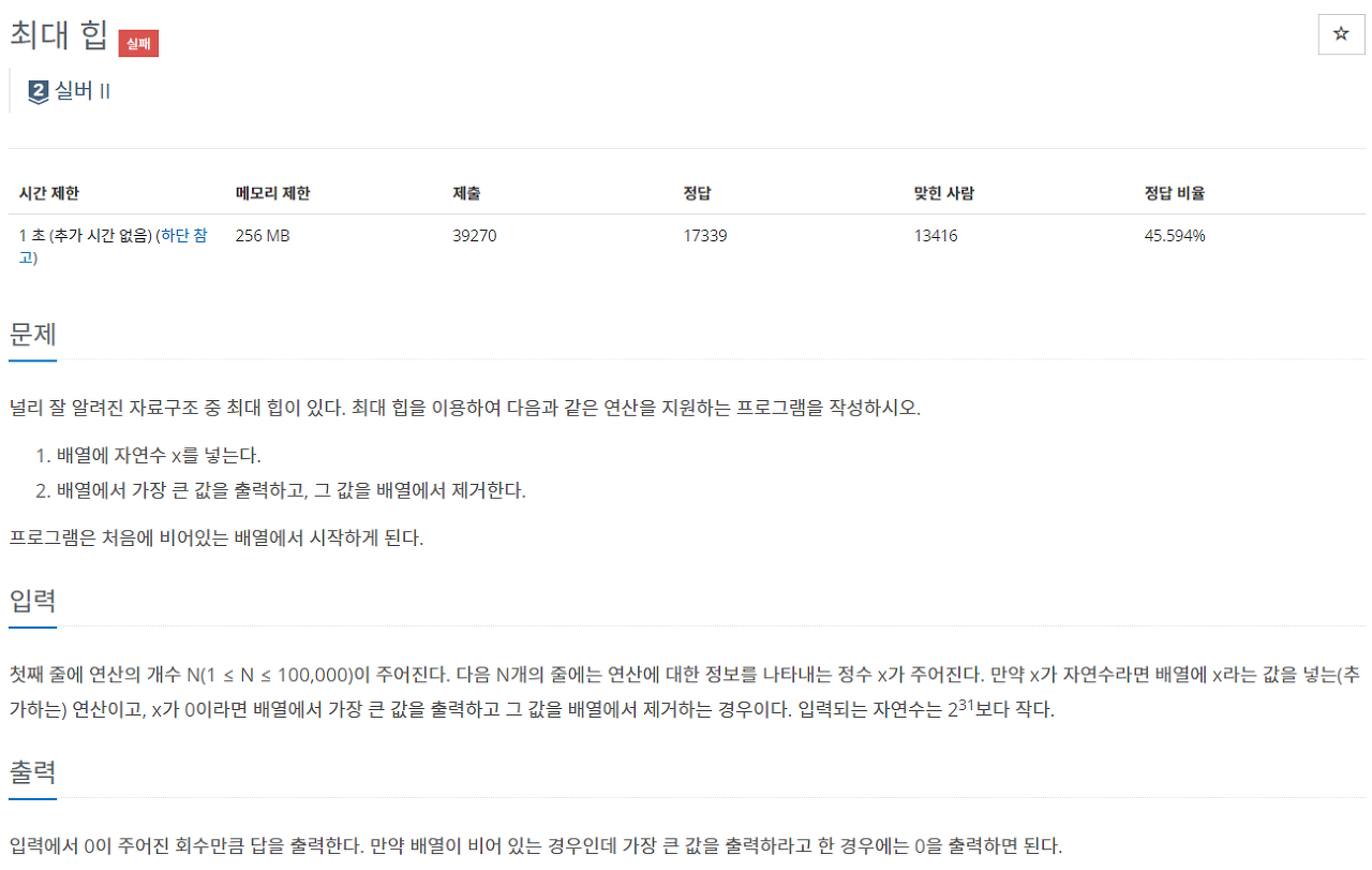 문제 널리 잘 알려진 자료구조 중 최대 힙이라는 것이 있다. 최대 힙을 이용하여 다음과 같은 연산을 지원하는 프로그램을 작성하시오. 배열에 자연수 x를 넣는다. 배열에서 가장 큰 값을 출력하