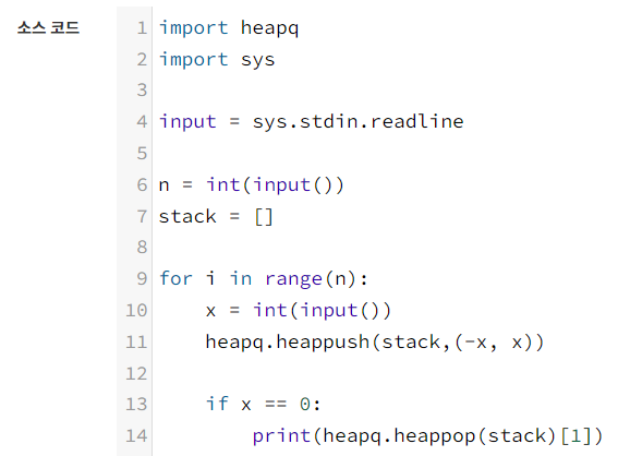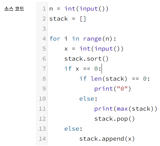 - x가 0일 때, stack의 길이가 0일 경우 0을 출력하고 길이가 0이 아닐 경우 stack의 가장 큰 값을 출력 후 stack에서 제거한다.