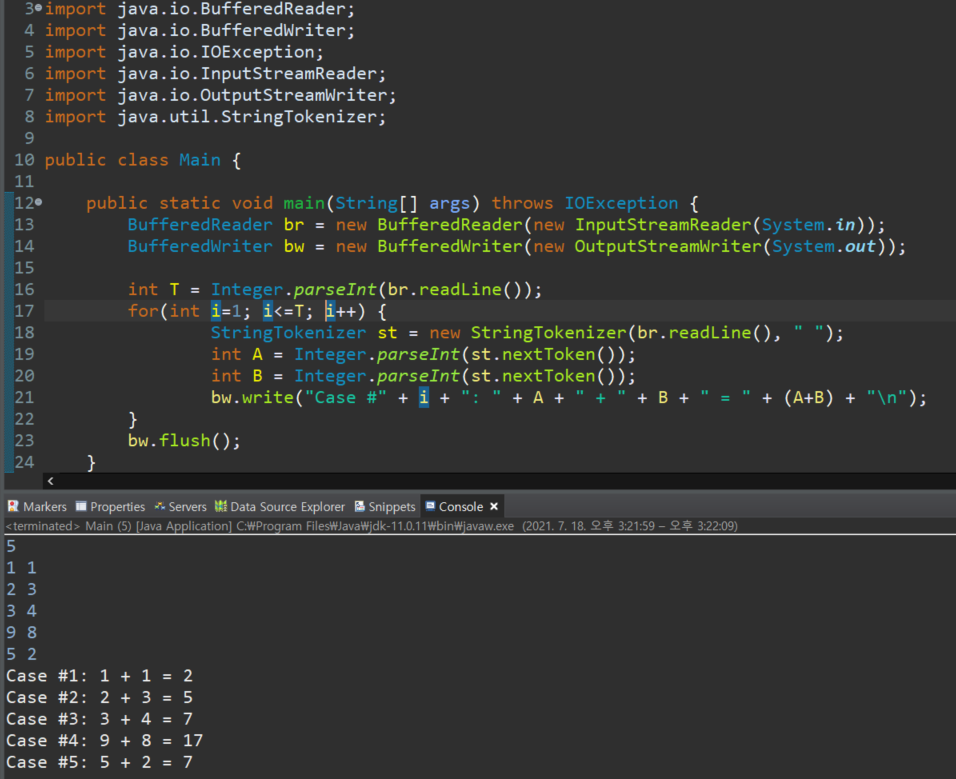 | [백준 알고리즘] 11021번: A+B - 7 (Java: for문) (0) | 2021.07.18 |