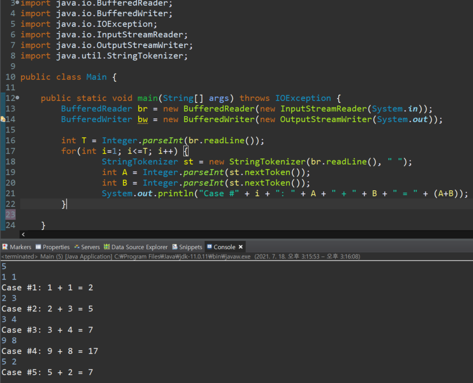 | [백준 알고리즘] 11021번: A+B - 7 (Java: for문) (0) | 2021.07.18 |