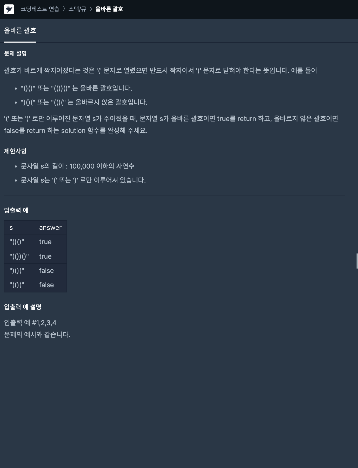- 스택을 사용해서 괄호의 ( ) 쌍이 맞는지 확인하는 문제로, 만약 ) 시작하거나 (로 시작해도 (() 처럼 쌍이 맞지 않을 경우 false를 리턴해야한다. 스택을 사용할 경우 마지막에 배열의 개수가 0인지 검증하고, 아니면 단순히 덧셈, 뺄셈으로 0인지 검증해도 된다.