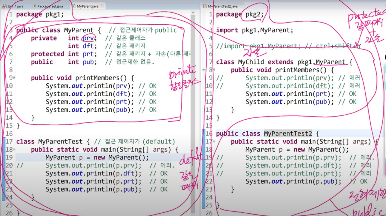 *쉽게 생각하면, private 는 같은 파일 내부이고 default는 같은 폴더 내부이며, protected는 같은폴더 + 자손이라고 볼 수 있음