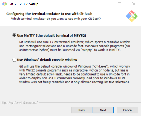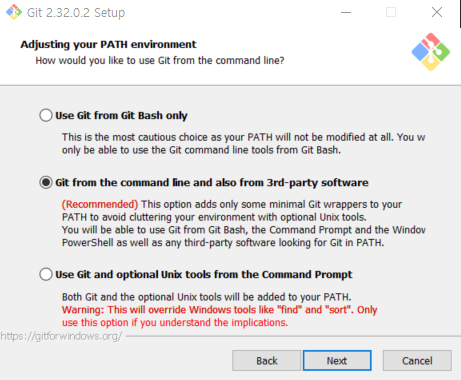 *Use Git and optional Unix tools from the Command Prompt: git과 unix 도구에서 git 사용 (충돌있을 수 있으니 주의할 것)