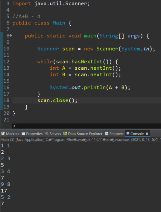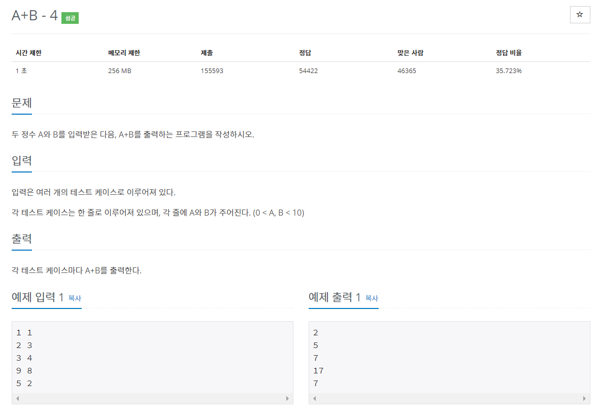 다른 블로거가 작성한 포스팅을 보니 입력의 종료는 EOF(추가로 읽을 수 있는 데이터 / End of File)가 없을 때 종료되어야한다고 기재되어 있다. 해당 문제를 풀이하면서 예제 입력에는 여러번의 테스트 케이스가 있는데 실제로 내가 먼저 제출한 코드에는 1회에 대한 것만 코딩되어 있어서 의아하긴 했다.