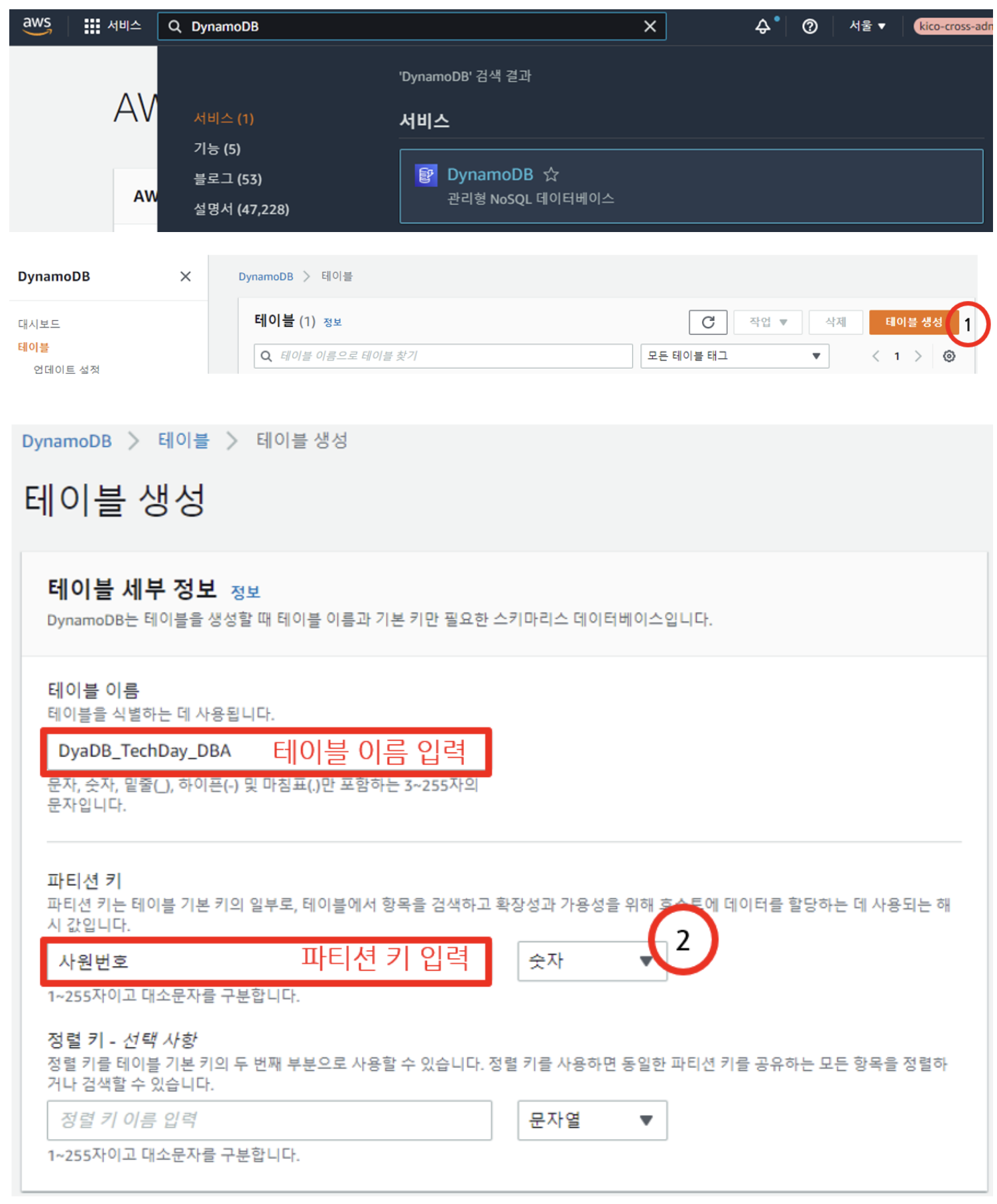 AWS 홈페이지에서 DynamoDB 검색 및 테이블 생성