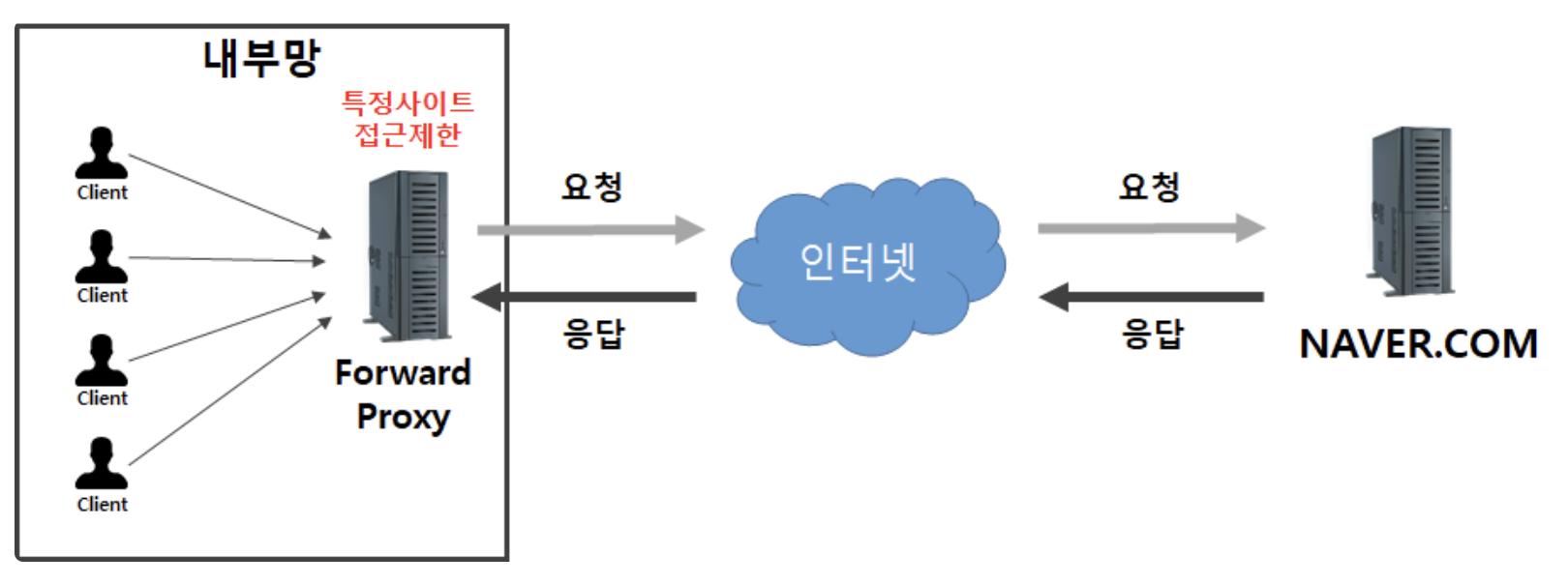 만약 사용자가 naver.com에 연결하려고 하면, 사용자 PC에서 해당 서버로 직접 연결하는게 아니라 포워드 프록시 서버가 먼저 요청을 ㄹ받고 naver.com에 연결하여 그 결과를 클라이언트에게 전달(Foward)해준다.