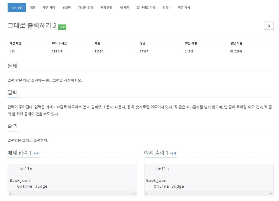 https://www.acmicpc.net/problem/11718 11718번: 그대로 출력하기 입력이 주어진다. 입력은 최대 100줄로 이루어져 있고, 알파벳 소문자, 대문자, 공백, 숫자로만 이루어져 있다. 각 줄은 100글자를 넘지 않으