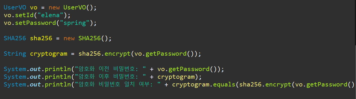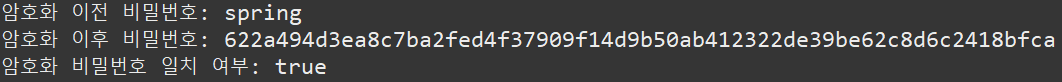 - 콘솔 출력문을 통해 알 수 있듯이 암호화가 진행된 것이 확인 가능하며, 비밀번호 일치 결과가 true 인 것을 알 수 있다.