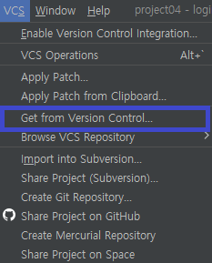 1. 파이참의 상단 메뉴바 [VCS] 에서 파란색 표시된 [Get from Version Control] 클릭