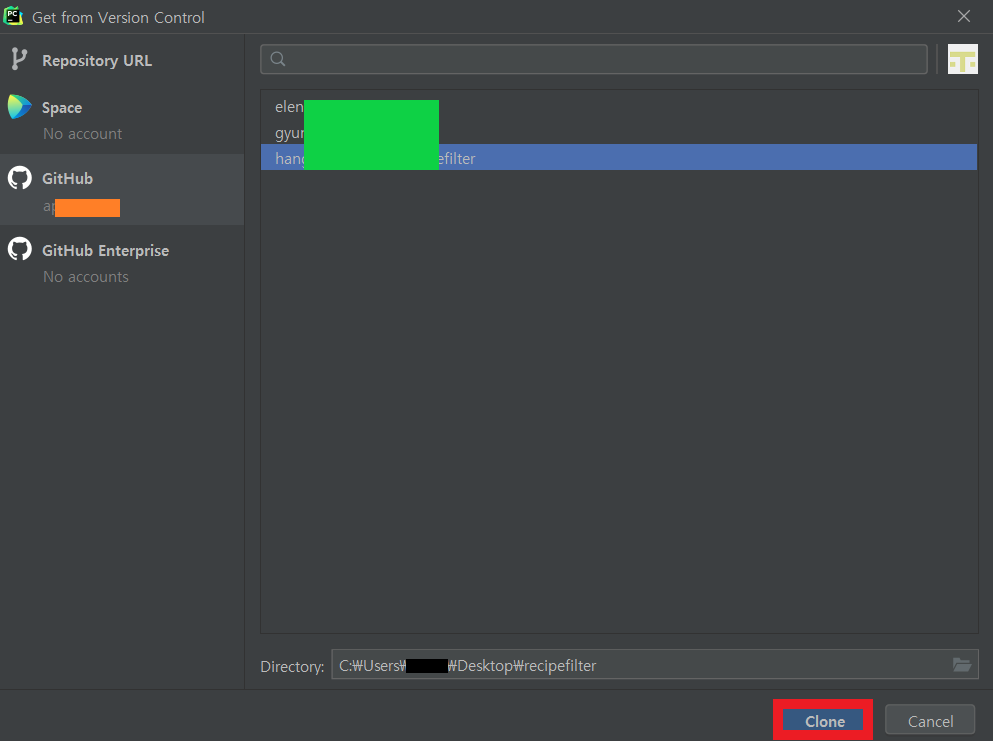 * GitHub 글자 밑에 GitHub 아이디가 표시될 것이고, 우측에는 git repo 이름들이 뜬다. 그 중 연결 원하는 repo를 클릭하고 우측 하단의 Clone 버튼 클릭 (Directory 원하는대로 변경해도 되지만 기본 설정으로 진행하였음)