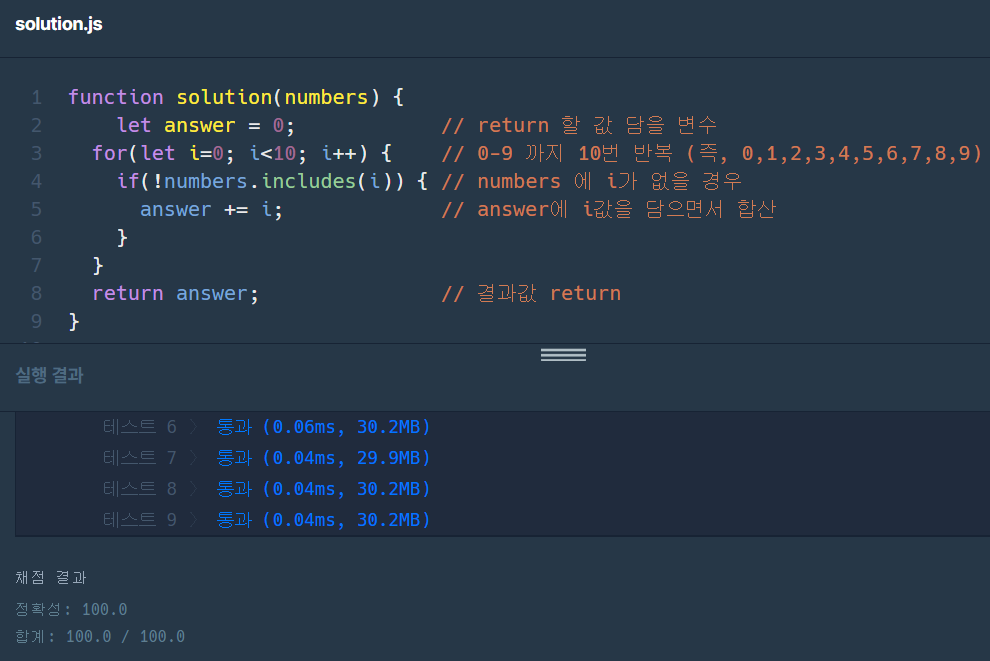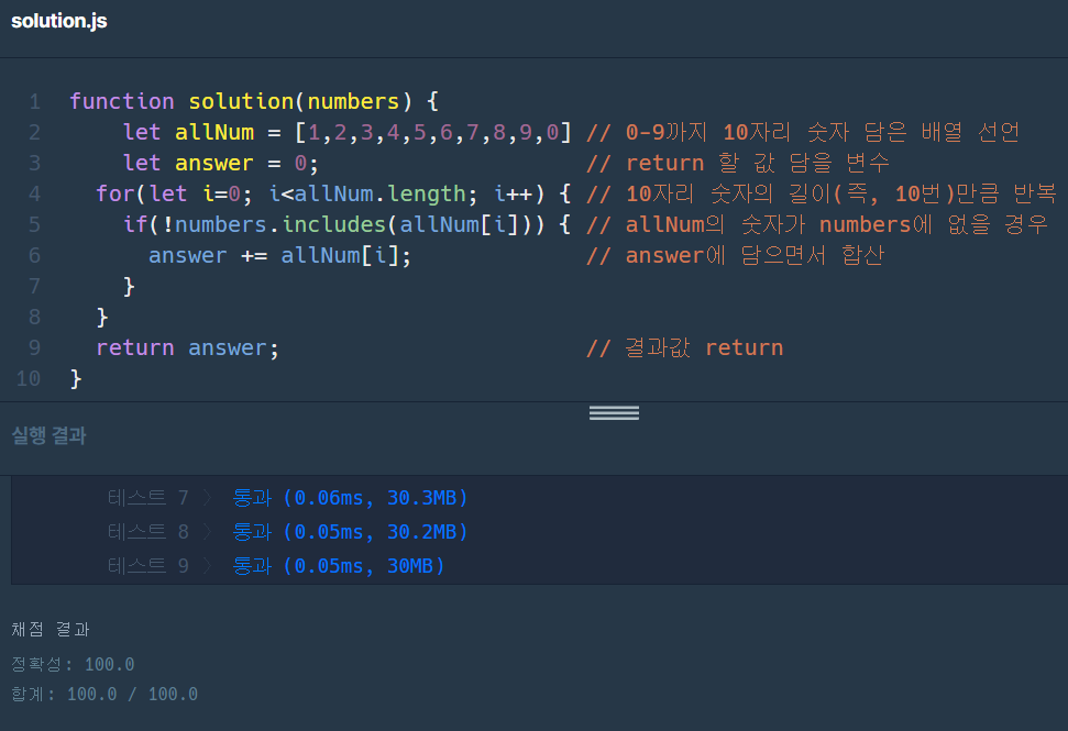 💡 numbers의 숫자를 모두 더하고 0부터 9의 합계인 45에서 빼는 방법을 사용한 코드