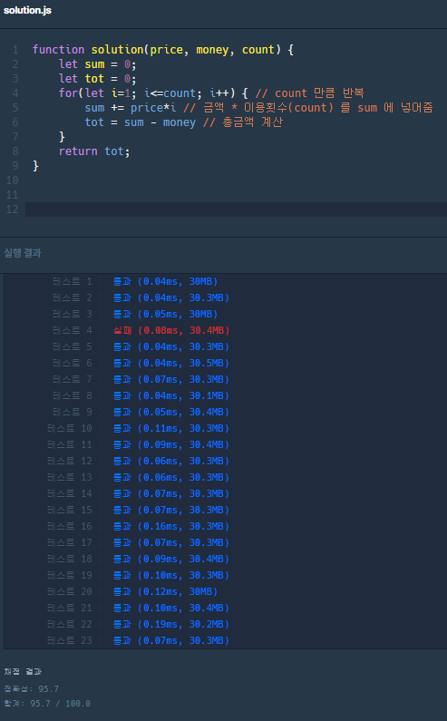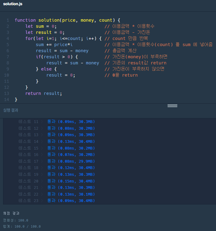 - 4번 부분을 처리하기 위해서 if - else 문을 추가했다. result 값이 양수로 나올 경우 돈이 부족한 것이고, 0이나 음수로 나올 경우 돈이 부족하지 않은 것이기 때문에 문제의 조건에 따라 0을 return 해주면 끝!