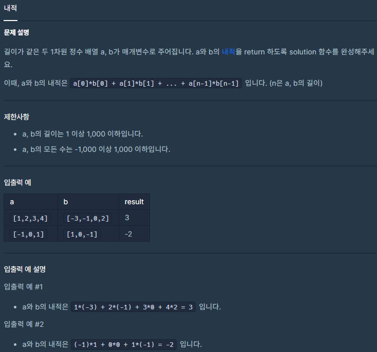 👉 내적이 뭔지는 몰랐으나 입출력 예를 보고, a와 b 배열의 같은 위치에 있는 값들을 곱하고 모든 값을 더하라는 뜻으로 생각했다.