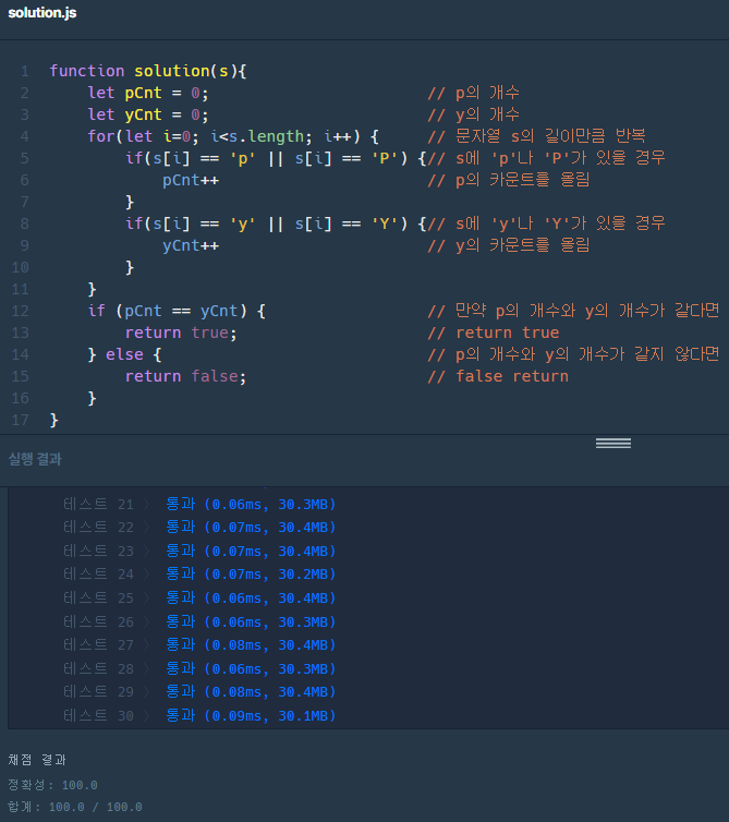 대문자와 소문자가 섞여있는 문자열 s가 주어집니다. s에 'p'의 개수와 'y'의 개수를 비교해 같으면 True, 다르면 False를 return 하는 solution를 완성하세요. 'p', 'y' 모두 하나도 없는 경우는 항상 True를