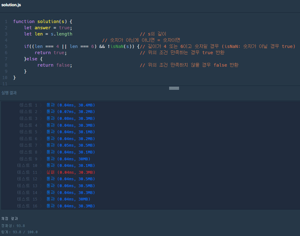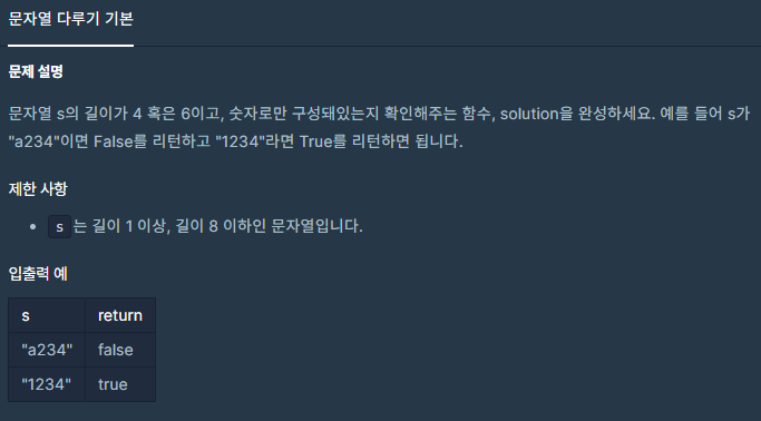 문자열 s의 길이가 4 혹은 6이고, 숫자로만 구성돼있는지 확인해주는 함수, solution을 완성하세요. 예를 들어 s가 "a234"이면 False를 리턴하고 "1234"라면 True를 리턴하면 됩니다. 제한 사항 s는 길이 1