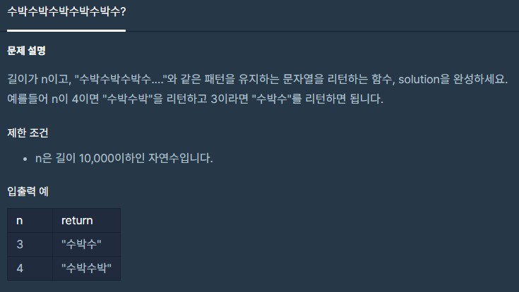 길이가 n이고, "수박수박수박수...."와 같은 패턴을 유지하는 문자열을 리턴하는 함수, solution을 완성하세요. 예를들어 n이 4이면 "수박수박"을 리턴하고 3이라면 "수박수"를 리턴하면 됩니다. 제한
