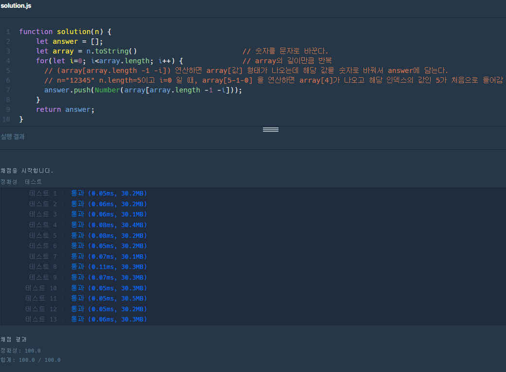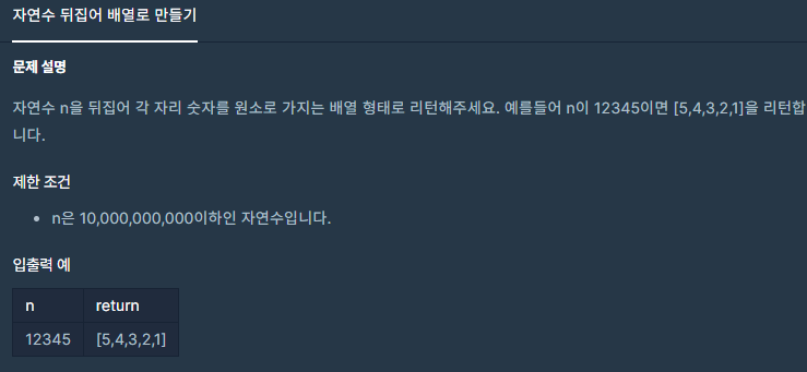 자연수 n을 뒤집어 각 자리 숫자를 원소로 가지는 배열 형태로 리턴해주세요. 예를들어 n이 12345이면 [5,4,3,2,1]을 리턴합니다. 제한 조건 n은 10,000,000,000이하인 자연수입니다. 입출력 예 n return 12345