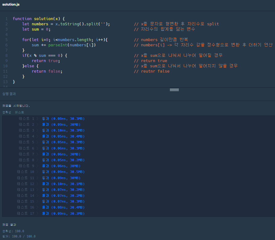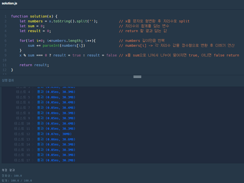 x % sum === 0 ? result = true : result = false // x를 sum으로 나눠서 나누어 떨어지면 true, 아니면 false return