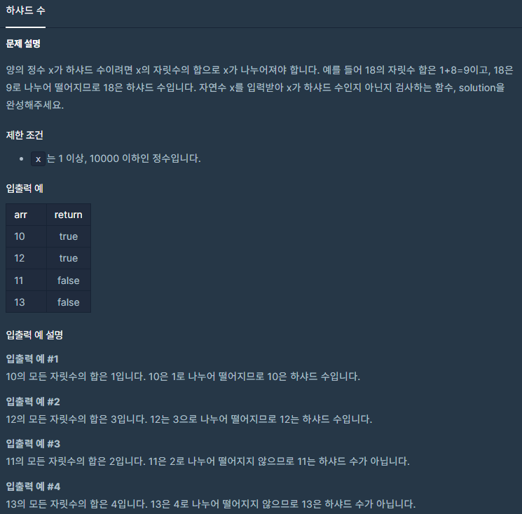양의 정수 x가 하샤드 수이려면 x의 자릿수의 합으로 x가 나누어져야 합니다. 예를 들어 18의 자릿수 합은 1+8=9이고, 18은 9로 나누어 떨어지므로 18은 하샤드 수입니다. 자연수 x를 입력받아 x가 하