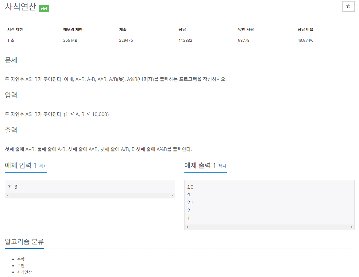 두 자연수 A와 B가 주어진다. 이때, A+B, A-B, A*B, A/B(몫), A%B(나머지)를 출력하는 프로그램을 작성하시오.