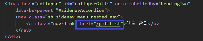 - href="giftList" ๋ผ๊ณ ๊ฒฝ๋ก๋ฅผ ๋ง์ถฐ๋์๋๋ฐ, / ๋ฅผ ์ถ๊ฐํด์ ํด๊ฒฐํ๋ค.