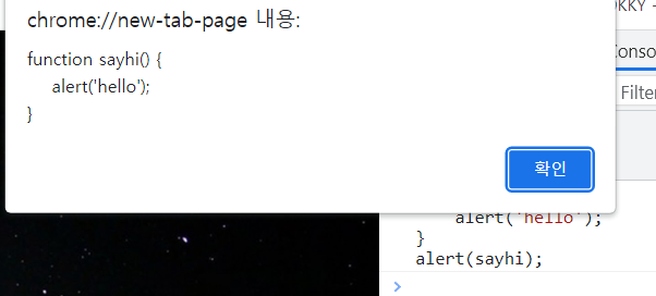 - 함수는 값이고 변수에 할당 가능함. 아래 예시와 같이 실행할 경우 괄호가 없기 때문에 실행되지 않지만 해당 함수의 코드가 출력됨.