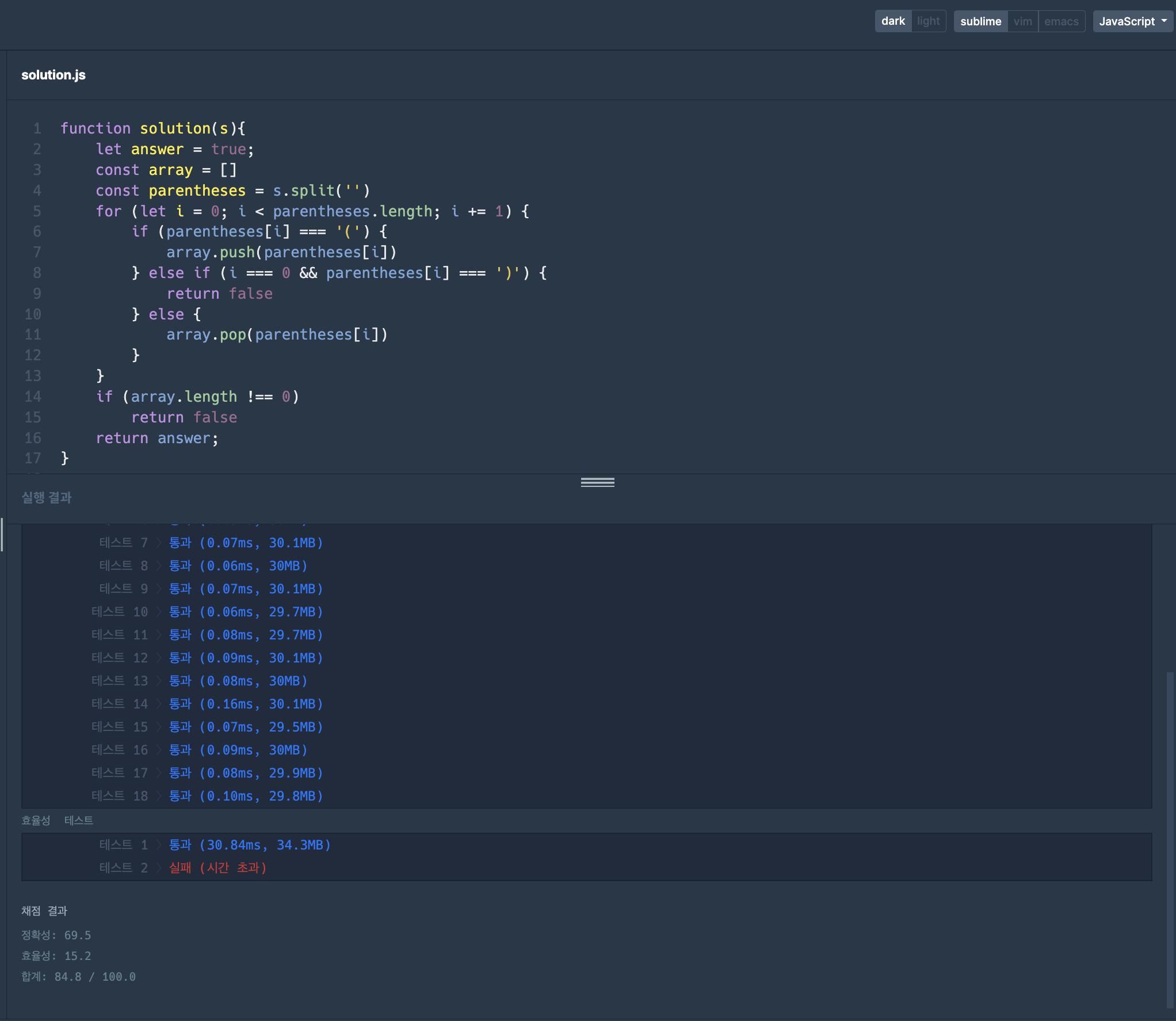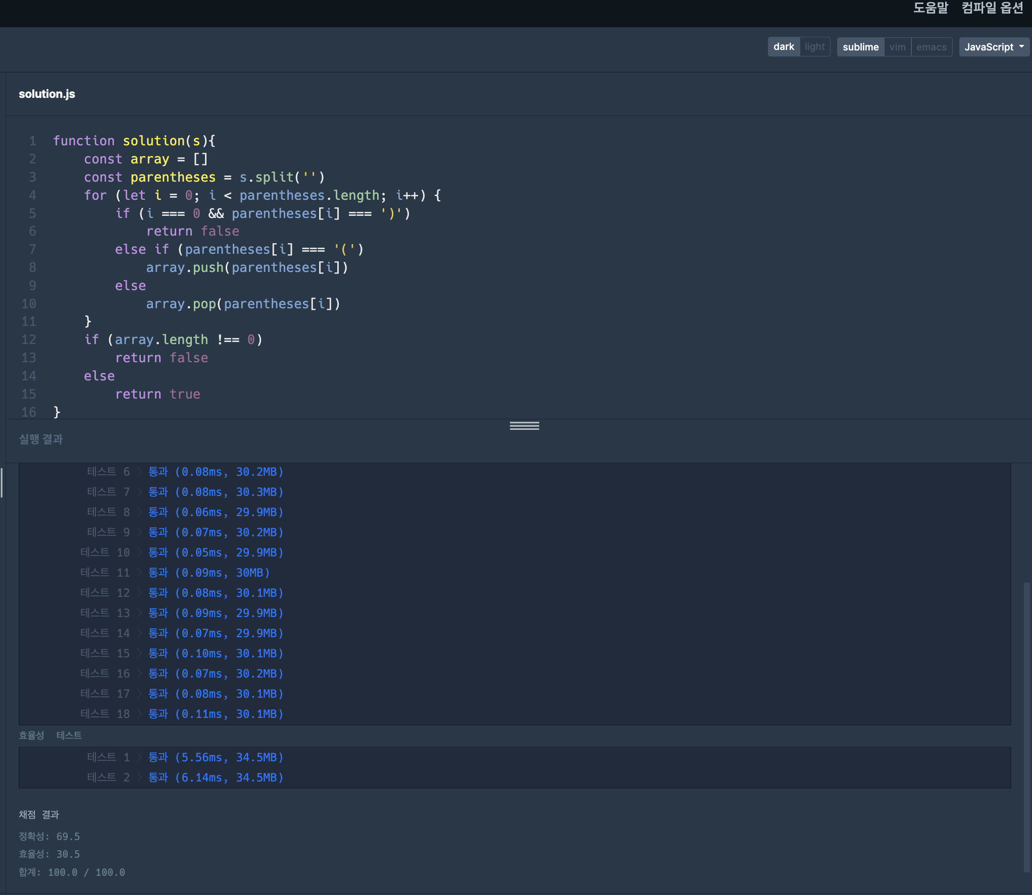 - 세번째로 push, pop을 사용했으나, else-if 로 특정 케이스에 부합하지 않을 경우 곧바로 false를 return하도록 했다. 더불어 answer 변수에 담지 않고 각 분기마다 곧바로 return 하도록 했더니 효율성도 통과했다.