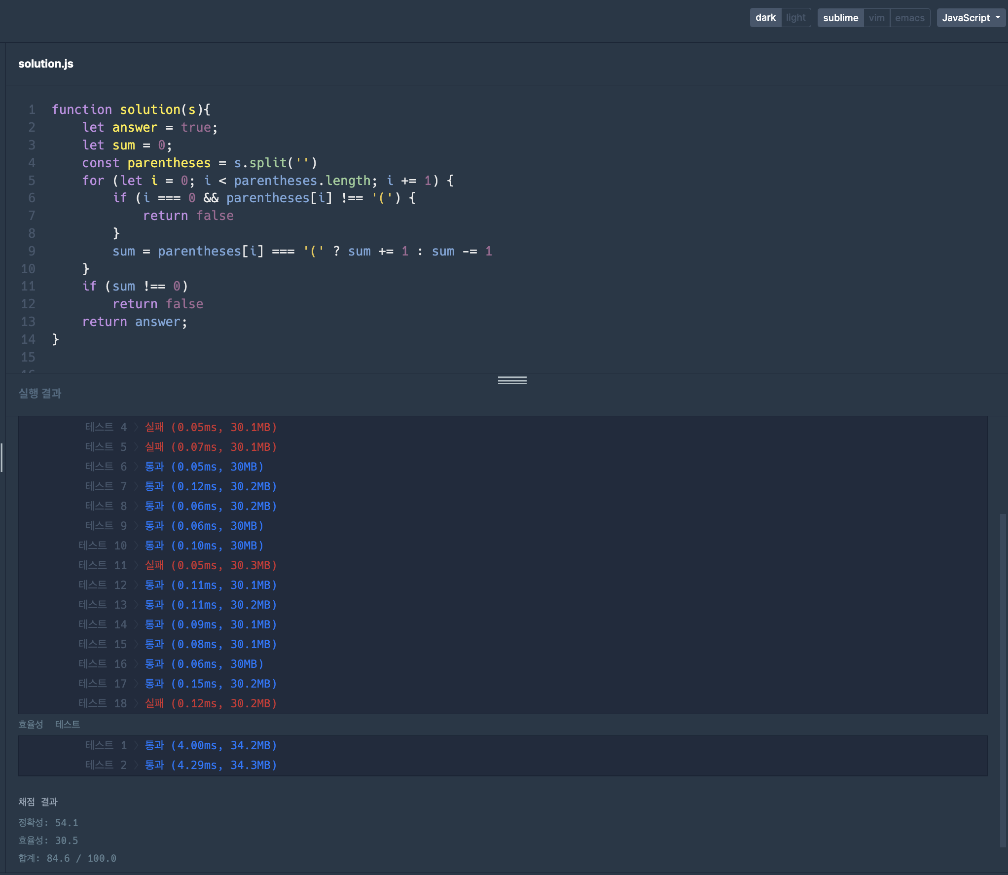 - 이번 문제는 이전에 백준에서도 여러 케이스로 풀어서 '('이면 더하고, ')'이면 빼질 수 있도록 했는데, 일부 테스트 케이스에서 통과하지 못했다.