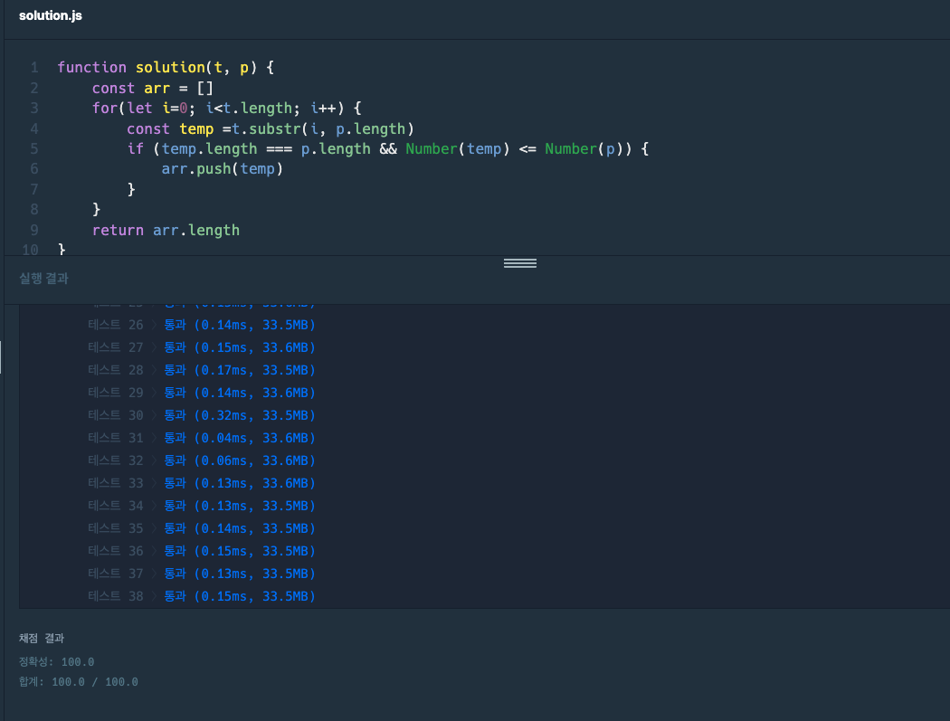 2) t의 길이만큼 반복한다. (여기서 temp의 길이가 p의 길이보다 작을 때 반복문을 탈출하도록 만들어 줘야하는데 누락...)
