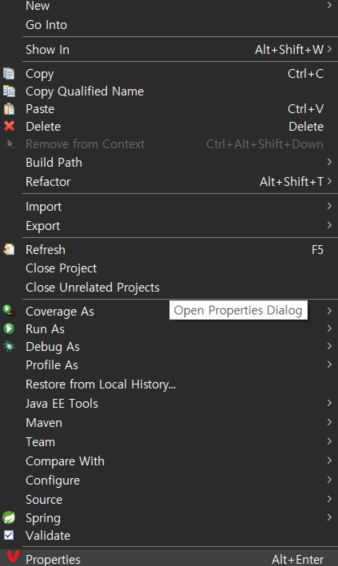 - 프로젝트 우클릭 후 하단의 properties 클릭