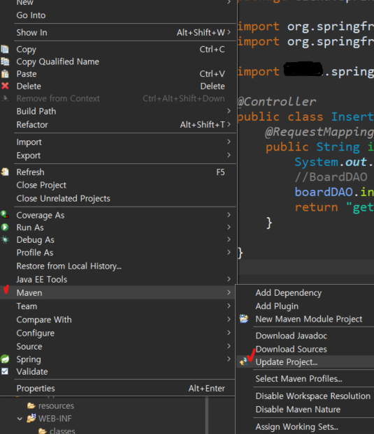 - 프로젝트에서 우측 클릭 -> Maven 선택 -> Update Project