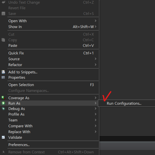 어제 복습을 하고 테스트 해보려니까 Run As의 Run on Server가 사라진 것...!