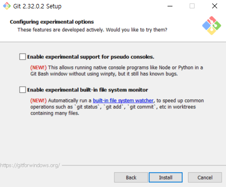 *Use Git and optional Unix tools from the Command Prompt: git과 unix 도구에서 git 사용 (충돌있을 수 있으니 주의할 것)