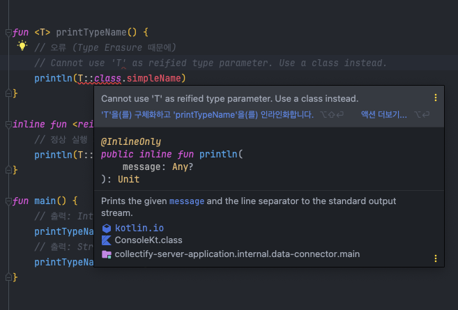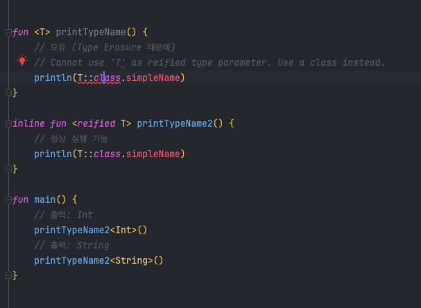 - 하지만 inline 함수에서 reified를 사용하면 타입 정보를 런타임에서도 유지 가능