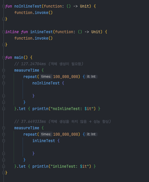 - 고차 함수를 사용할 때는 성능을 위해 inline을 적극 활용하는 것이 좋음
