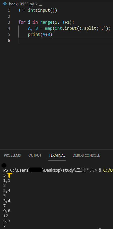 2) 각 줄에 A와 B를 입력 받는다. - map 을 사용하여 두 변수를 입력 받음